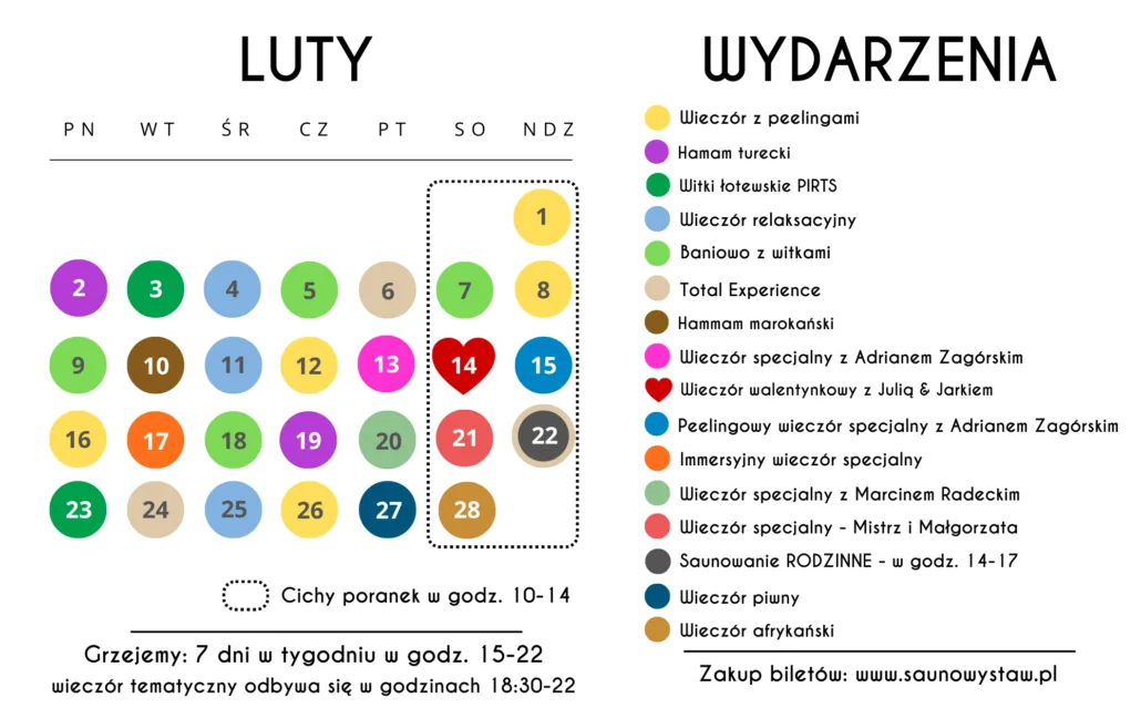 Zajrzyj do lutowego kalendarza wydarzeń i wybierz wieczór, który najlepiej odpowiada Twoim potrzebom. Zima może być ciepła - wystarczy dać jej przestrzeń.
