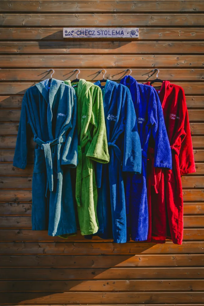 Zadbaj o komfort podczas chłodniejszych dni w naszym ośrodku saunowym. Nasze miękkie, przyjemne w dotyku szlafroki to idealny sposób na relaks między seansami. Możesz je wypożyczyć na miejscu, by cieszyć się ciepłem i wygodą lub zakupić i zabrać do domu, aby przedłużyć komfort saunowych chwil także po powrocie.